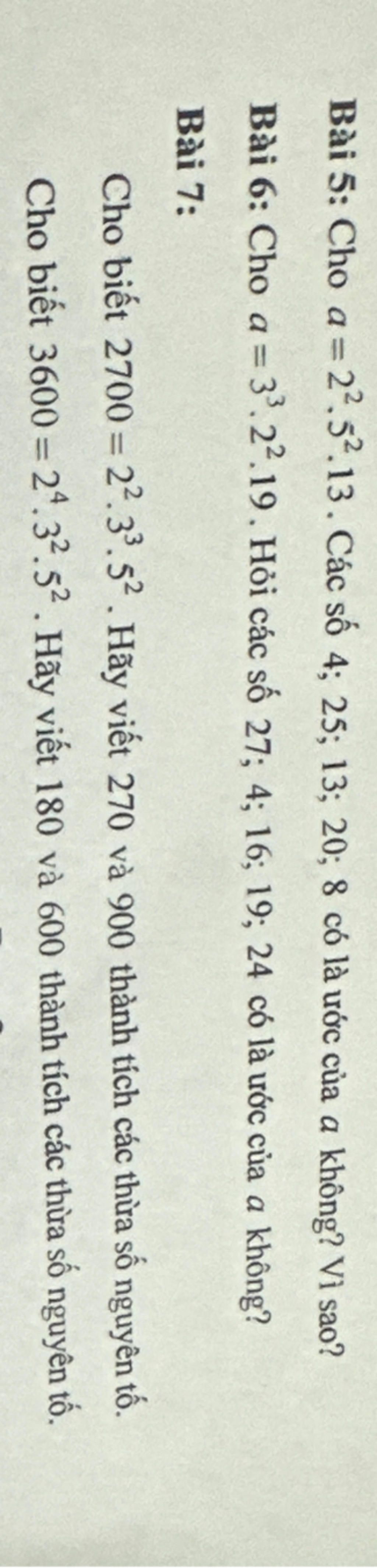 Bài 5: Cho a = 22.52.13 . Các số 4; 25; 13; 20; 8 có là ước của a không? Vì sao?