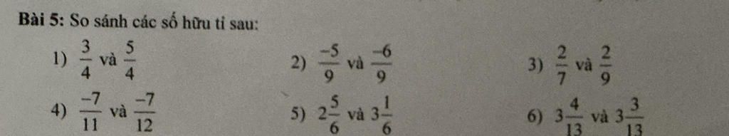 4, `-7/11` < `7/12` vì cùng tử mà mẫu nào bé hơn thì quy đồng sẽ lớn hơn mà số âm càng bé thì càng lớn nên `-7/11` < `7/12`
