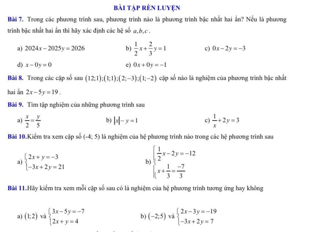 `\color{#0074D9}{#y}\color{#0088DD}{l}\color{#3399FF}{i}\color{#66AAFF}{n}\color{#99CCFF}{h}`$\\$ $\text{Bài 7.}$ $a) 2024x - 2025y = 2026 \\$ \(\Rightarrow\) Là phương trình bậc nhất hai ẩn với \( a = 2024, b = -2025, c = 2026 \) $\\$ b) \( \dfrac{1}{2}x + \dfrac{2}{3}y = 1 \) $\\$ \(\Rightarrow\) Là phương trình bậc nhất hai ẩn với \( a = \dfrac{1}{2}, b = \dfrac{2}{3}, c = 1 \) $\\$ c) \( 0x - 2y = -3 \Rightarrow -2y = -3 \Rightarrow y = \dfrac{3}{2} \) $\\$ \(\Rightarrow\) Là phương trình bậc nhất một ẩn. $\\$ d) \( x - 0y = 0 \Rightarrow x = 0 \) $\\$ \(\Rightarrow\) Là phương trình bậc nhất một ẩn. e) \( 0x + 0y = -1 \Rightarrow 0 = -1 \) (vô lý) $\\$ \(\Rightarrow\) Phương trình vô nghiệm, không phải phương trình bậc nhất hai ẩn. $\\$ $\text{Bài 8.}$ Thử lần lượt: - Với \( (12;1) \): \( 2 \cdot 12 - 5 \cdot 1 = 24 - 5 = 19 \Rightarrow \) Thỏa mãn $\\$ - Các cặp còn lại: - \( (1;1): 2 - 5 = -3 \ne 19 \) $\\$ - \( (2;-3): 4 + 15 = 19 \Rightarrow \)$\\$ - \( (1;-2): 2 + 10 = 12 \ne 19 \)$\\$ Thỏa mãn $\\$ \(\Rightarrow\) Hai cặp thỏa mãn là \( (12;1) \) và \( (2;-3) \) $\\$ $\text{Bài 9.}\\$ a) \( \dfrac{x}{2} = \dfrac{y}{5} \Rightarrow 5x = 2y \Rightarrow y = \dfrac{5}{2}x \) $\\$ \(\Rightarrow\) Tập nghiệm: \( \{(x; \dfrac{5}{2}x) \mid x \in \mathbb{R} \} \)$\\$ b) \( |x - y| = 1 \) \(\Rightarrow x - y = 1 \) hoặc \( x - y = -1 \Rightarrow \) \[ \begin{cases} y = x - 1 \\ y = x + 1 \end{cases} \Rightarrow \text{Tập nghiệm là 2 đường thẳng song song} \] c) \( \dfrac{1}{x} + 2y = 3 \) Điều kiện: \( x \ne 0 \). Khi đó: \[ 2y = 3 - \dfrac{1}{x} \Rightarrow y = \dfrac{3}{2} - \dfrac{1}{2x} \] \(\Rightarrow\) Tập nghiệm: \( \{(x; \dfrac{3}{2} - \dfrac{1}{2x}) \mid x \in \mathbb{R}, x \ne 0 \} \) $\\$ $\text{Bài 10.}$ Kiểm tra xem cặp số \( (-4; 5) \) là nghiệm của hệ phương trình nào trong các hệ phương trình sau: $\text{a)} $ \[ \begin{cases} 2x + y = -3 \\ -3x + 2y = 21 \end{cases} \] Thay \( x = -4, y = 5 \) vào từng phương trình: $\\$ \( 2(-4) + 5 = -8 + 5 = -3 \Rightarrow \) Thỏa mãn phương trình 1 \( -3(-4) + 2 \cdot 5 = 12 + 10 = 22 \ne 21 \Rightarrow \) Không thỏa mãn phương trình 2 $\\$ \(\Rightarrow\) Không là nghiệm hệ a $\\$ $\text{b)} $ \[ \begin{cases} \dfrac{1}{2}x - 2y = -12 \\ x + \dfrac{1}{3} = \dfrac{-7}{3} \end{cases} \] Thay \( x = -4, y = 5 \): $\\$ Phương trình 1: \( \dfrac{1}{2} \cdot (-4) - 2 \cdot 5 = -2 - 10 = -12 \Rightarrow \) Thỏa mãn $\\$ Phương trình 2: \( -4 + \dfrac{1}{3} = \dfrac{-12 + 1}{3} = \dfrac{-11}{3} \ne \dfrac{-7}{3} \Rightarrow \) Không thỏa mãn $\\$ \(\Rightarrow\) Không là nghiệm hệ b \(\Rightarrow\) Cặp số \( (-4;5) \) $\text{không là nghiệm của hệ nào trong 2 hệ đã cho}$ $\text{Bài 11.}$ Hãy kiểm tra xem mỗi cặp số sau có là nghiệm của hệ phương trình tương ứng hay không: $\\$ $\text{a)}$ \( (1;2) \) với hệ: \[ \begin{cases} 3x - 5y = -7 \\ 2x + y = 4 \end{cases} \] Thay \( x = 1, y = 2 \): $\\$ \( 3 \cdot 1 - 5 \cdot 2 = 3 - 10 = -7 \Rightarrow \) Thỏa mãn $\\$ - \( 2 \cdot 1 + 2 = 2 + 2 = 4 \Rightarrow \) Thỏa mãn $\\$ \(\Rightarrow\) Cặp số \( (1;2) \) là nghiệm của hệ phương trình. $\\$ $\text{b)}$ \( (-2;5) \) với hệ: \[ \begin{cases} 2x - 3y = -19 \\ -3x + 2y = 7 \end{cases} \] Thay \( x = -2, y = 5 \): \( 2 \cdot (-2) - 3 \cdot 5 = -4 - 15 = -19 \Rightarrow \) Thỏa mãn $\\$ \( -3 \cdot (-2) + 2 \cdot 5 = 6 + 10 = 16 \ne 7 \Rightarrow \) Không thỏa mãn $\\$ \(\Rightarrow\) Cặp số \( (-2;5) \) $\\$ $\text{không}$ là nghiệm của hệ phương trình.