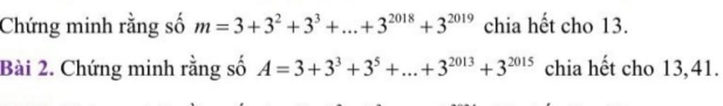 Vì `13 ⋮ 13` nên `m = 3 + 3^2 + 3^3 + ... + 3^2018 + 3^2019 ⋮ 13 `