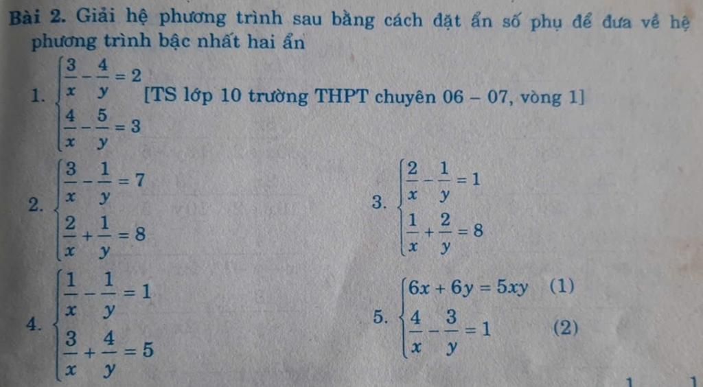 $\text{Bài 1}$ \[ \begin{cases} \dfrac{3}{x} - \dfrac{4}{y} = 2 \\ \dfrac{4}{x} - \dfrac{5}{y} = 3 \end{cases} \] Đặt \( u = \dfrac{1}{x},\ v = \dfrac{1}{y} \Rightarrow \begin{cases} 3u - 4v = 2 \\ 4u - 5v = 3 \end{cases} \) Lấy (2) trừ (1): \[ 4u - 5v - (3u - 4v) = 3 - 2 \Rightarrow u - v = 1 \Rightarrow u = v + 1 \] Thay vào (1): \[ 3(v + 1) - 4v = 2 \Rightarrow 3v + 3 - 4v = 2 \Rightarrow -v = -1 \Rightarrow v = 1 \Rightarrow u = 2 \] \[ x = \dfrac{1}{u} = \dfrac{1}{2}, \quad y = \dfrac{1}{v} = 1 \Rightarrow \boxed{x = \dfrac{1}{2},\ y = 1} \] $\text{Bài 2}$ \[ \begin{cases} \dfrac{3}{x} - \dfrac{1}{y} = 7 \\ \dfrac{2}{x} + \dfrac{1}{y} = 8 \end{cases} Đặt u = \dfrac{1}{x},\ v = \dfrac{1}{y} \Rightarrow \begin{cases} 3u - v = 7 \\ 2u + v = 8 \end{cases} \] Cộng hai phương trình: \[ 5u = 15 \Rightarrow u = 3 \Rightarrow v = 3u - 7 = 9 - 7 = 2 \] \[ x = \dfrac{1}{u} = \dfrac{1}{3},\quad y = \dfrac{1}{v} = \dfrac{1}{2} \Rightarrow \boxed{x = \dfrac{1}{3},\ y = \dfrac{1}{2}} \] $\text{Bài 3}$ \[ \begin{cases} \dfrac{2}{x} - \dfrac{1}{y} = 1 \\ \dfrac{1}{x} + \dfrac{2}{y} = 8 \end{cases} Đặt u = \dfrac{1}{x},\ v = \dfrac{1}{y} \Rightarrow \begin{cases} 2u - v = 1 \\ u + 2v = 8 \end{cases} \] Từ (1): \( v = 2u - 1 \) Thay vào (2): \[ u + 2(2u - 1) = 8 \Rightarrow 5u - 2 = 8 \Rightarrow u = 2, \quad v = 3 \] \[ x = \dfrac{1}{u} = \dfrac{1}{2}, \quad y = \dfrac{1}{v} = \dfrac{1}{3} \Rightarrow \boxed{x = \dfrac{1}{2},\ y = \dfrac{1}{3}} \] $\text{Bài 4}$ \[ \begin{cases} \dfrac{1}{x} - \dfrac{1}{y} = 1 \\ \dfrac{3}{x} + \dfrac{4}{y} = 5 \end{cases} Đặt u = \dfrac{1}{x},\ v = \dfrac{1}{y} \Rightarrow \begin{cases} u - v = 1 \\ 3u + 4v = 5 \end{cases} \] Từ (1): \( u = v + 1 \) Thay vào (2): \[ 3(v + 1) + 4v = 5 \Rightarrow 7v = 2 \Rightarrow v = \dfrac{2}{7},\ u = \dfrac{9}{7} \] \[ x = \dfrac{1}{u} = \dfrac{7}{9}, \quad y = \dfrac{1}{v} = \dfrac{7}{2} \Rightarrow \boxed{x = \dfrac{7}{9},\ y = \dfrac{7}{2}} \] $\text{Bài 5}$ Ta có hệ phương trình: \[ \begin{cases} 6x + 6y = 5xy \quad (1) \\ \dfrac{4}{x} - \dfrac{3}{y} = 1 \quad (2) \end{cases} \] Chia hai vế phương trình (1) cho $xy$, ta được: \[ \frac{6x + 6y}{xy} = \frac{5xy}{xy} \Rightarrow \frac{6x}{xy} + \frac{6y}{xy} = 5 \Rightarrow \frac{6}{y} + \frac{6}{x} = 5 \quad (3) \] Đặt $u = \dfrac{1}{x},\ v = \dfrac{1}{y}$, khi đó hệ trở thành: \[ \begin{cases} 6u + 6v = 5 \quad (4) \\ 4u - 3v = 1 \quad (5) \end{cases} \] Nhân (5) với 2, ta có: \[ 8u - 6v = 2 \quad (6) \] Cộng (4) và (6): \[ 6u + 6v + 8u - 6v = 5 + 2 \Rightarrow 14u = 7 \Rightarrow u = \dfrac{1}{2} \] Thay vào (4): \[ 6 \cdot \dfrac{1}{2} + 6v = 5 \Rightarrow 3 + 6v = 5 \Rightarrow 6v = 2 \Rightarrow v = \dfrac{1}{3} \] Vậy $x = \dfrac{1}{u} = 2$, $y = \dfrac{1}{v} = 3$ \[ \boxed{x = 2;\ y = 3} \] \(\left[ \begin{array}{l}x=2\\x=-1\end{array} \right.\)