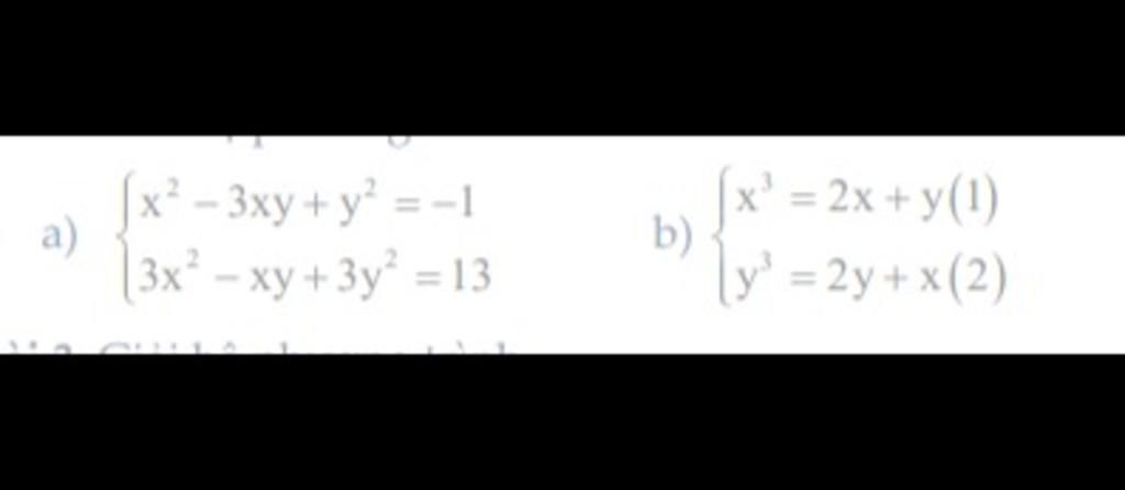 `{(x^2-3xy+y^2=-1 (1)),(3x^2-xy+3y^2=13):}`