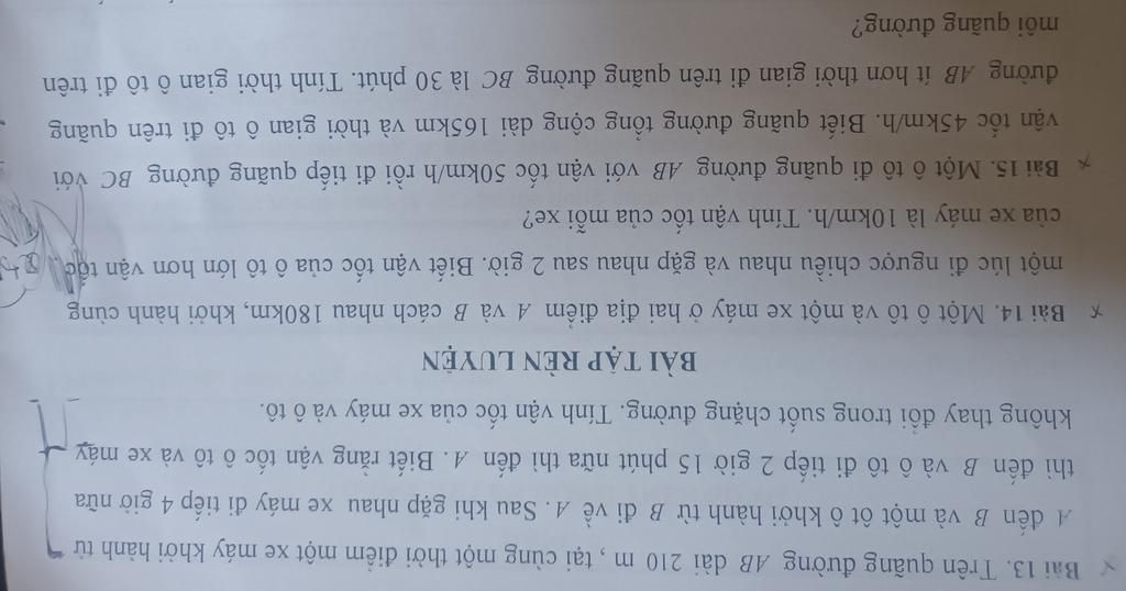 × Bài 13. Trên quãng đường AB dài 210 m, tại cùng một thời điểm một xe máy khởi hành từ