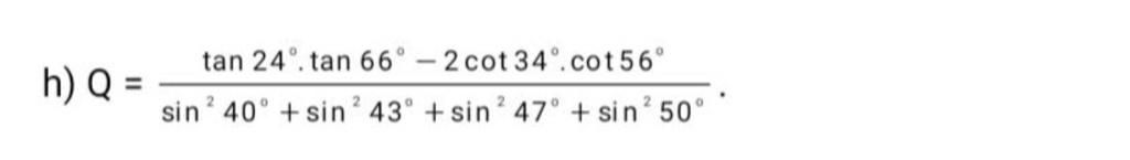 `Q=(tan24^@*tan66^@-2cot34^@*cot56^@)/(sin^2 40^@+sin^2 43^@+sin^2 47^@+sin^2 50^@)`