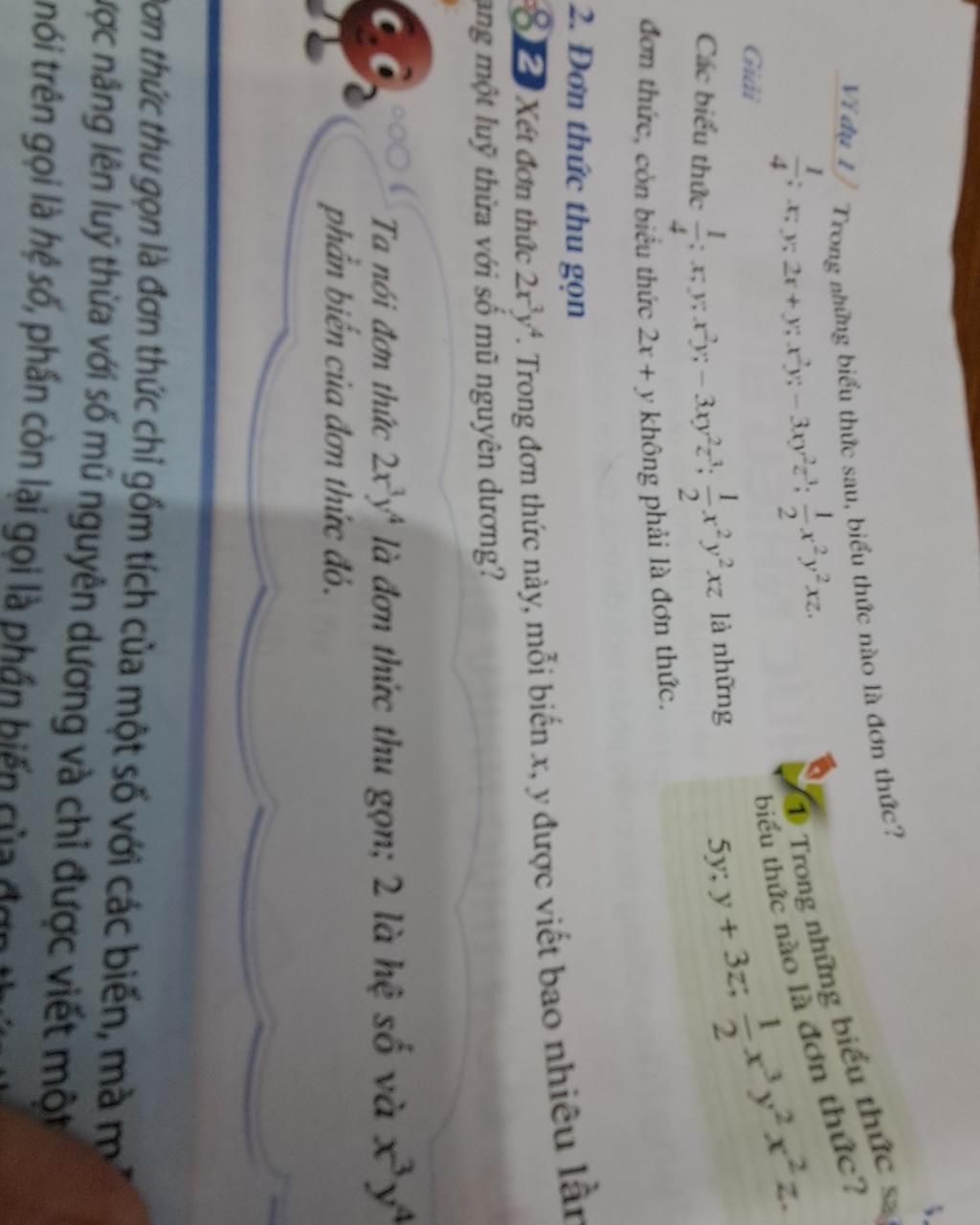 `o.` Đơn thức là một biểu thượng đại số gồm `1` số `,` `1` biến `,` hoặc `1` tích giữa các số và các biến `.`