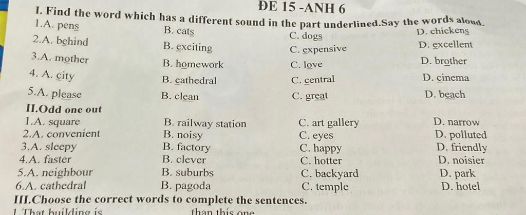 Đáp án:I. Find the word which has a different sound in the part underlined