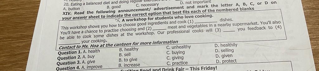 2)Từ cần điền là 1 động từ hoặc danh từ có liên quan đến việc lựa chọn thịt và rau củ ở siêu thị.