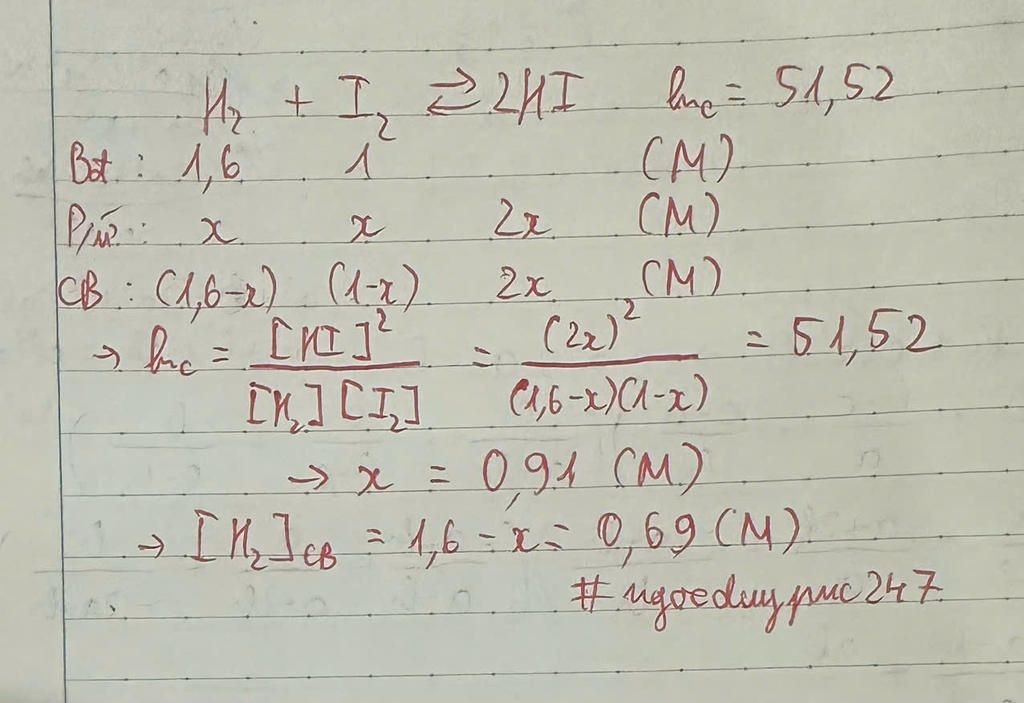 Cho `H_2+I_2`$\rightleftharpoons$`HI` có `K_C=51,52` Nồng độ ban đầu của `H_2` là 1,6M, `I_2` là 1M. Tính nồng độ `H_2` lúc cân bằng?