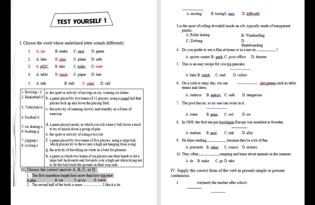 `-` Zorbing `->` là một môn thể thao mạo hiểm và giải trí, trong đó người chơi lăn xuống dốc (thường là một con dốc cỏ hoặc địa hình nhẹ) bên trong một quả cầu nhựa trong suốt khổng lồ.