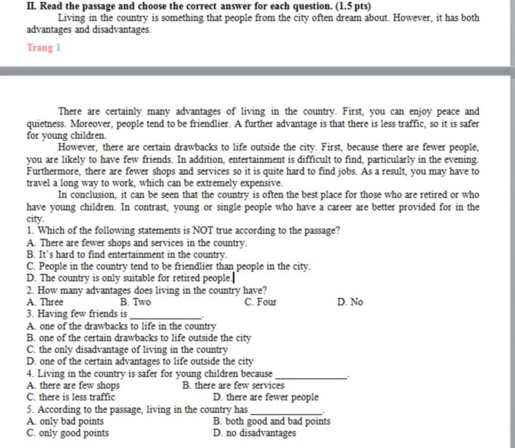 `-` Dẫn chứng : ... the country is often the best place for those who are retired or who have young children.