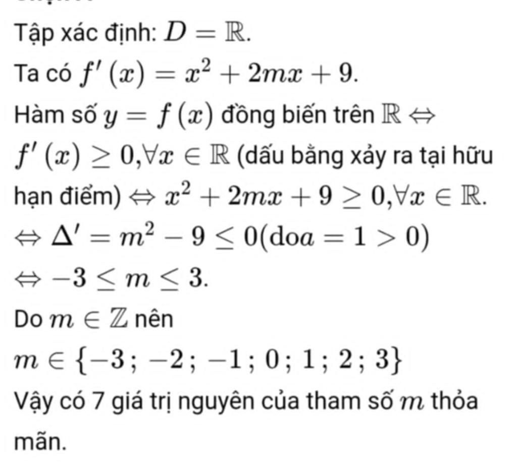 Đề : Có bao nhiêu giá trị nguyên của tham số m thuộc khoảng ( -2024; 2026 ) để hàm số `f(x) = 1/3x^3+mx^2+9x-3` đồng biến trên R?