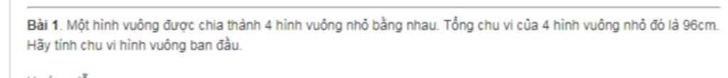Chu vi của mỗi hình là: `96÷4=24 (cm)`
