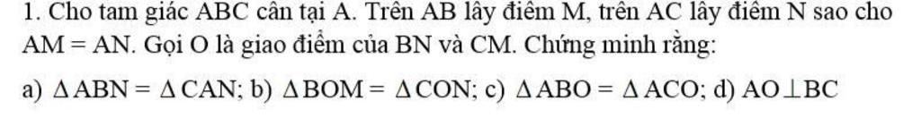 1. Cho tam giác ABC cân tại A. Trên AB lây điêm M, trên AC lây điểm N sao cho