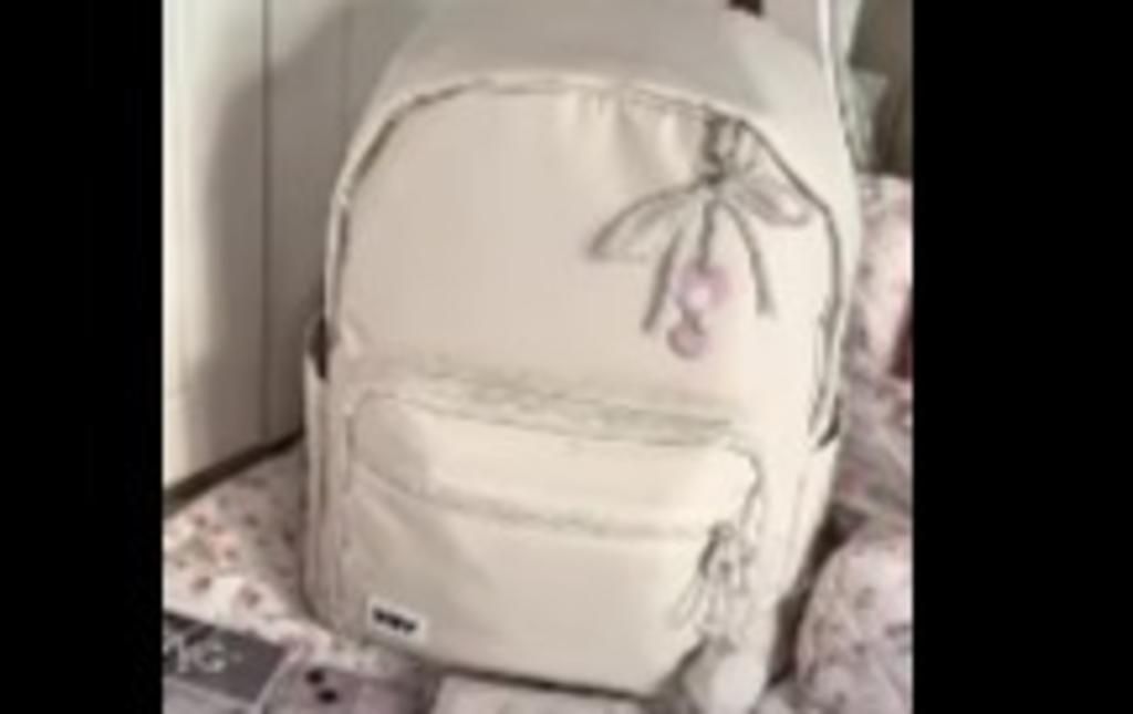 Phía trên cùng của balo còn có một quai xách nhỏ, em thường dùng để treo lên móc ở lớp học. Mặt trước balo có đính hai món đồ trang trí rất dễ thương. Một cái nơ trắng xinh xắn được gắn gần khóa kéo. Một trái anh đào hồng mềm mại đung đưa ở góc trên khiến chiếc balo trông rất nổi bật.