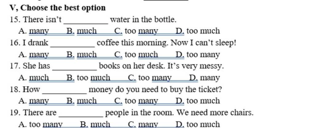 Câu 17.C vì coffee là danh từ ko đếm được, dung -> too much khi muốn nói `quá` `nhiều`.