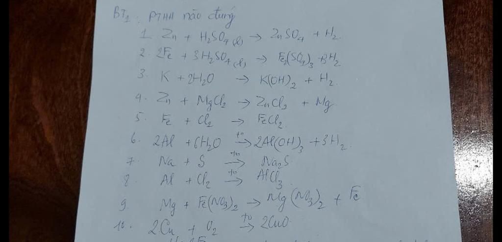 Các đáp án: `1;9;10;6` đúng do đã cân bằng `PTHH` và đều là `PTHH` có xảy ra.