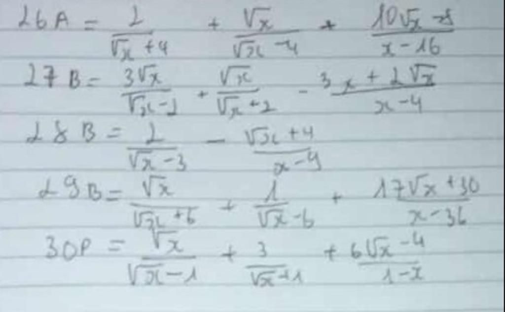 `B=(x-6sqrt(x)+sqrt(x)+6+17sqrt(x)+30)/((sqrt(x)+6)(sqrt(x)-6))`