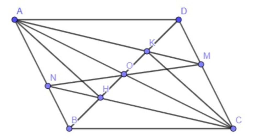 Cho hình bình hành ABCD, đường chéo BD. Kẻ AH và CK vuông góc với BD ở H và ở K. Chứng minh a. AK//CH b. Gọi M là giao điểm của AC và BC Gọi N là giao điểm của CH và AD chứng minh AM = CN c. Gọi O là trung điểm của BD Chứng minh ba điểm O M N thẳng hàng