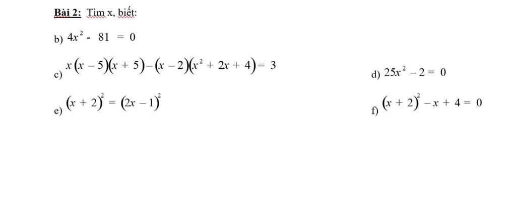 `e) ( x + 2 )^2 = ( 2x - 1 )^2`