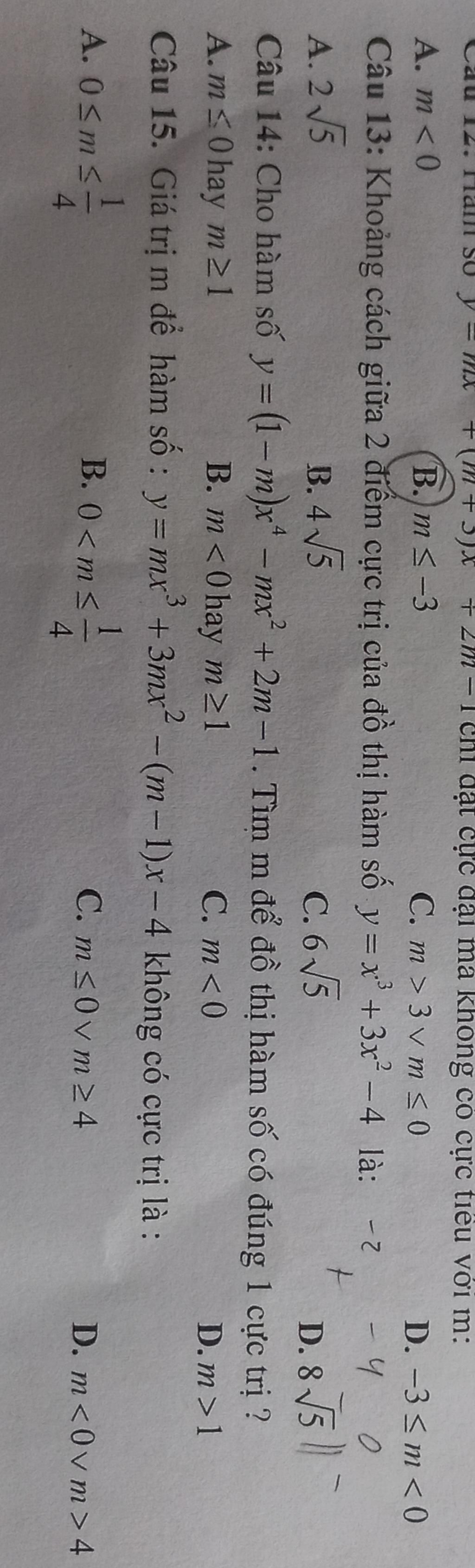 Câu 13: Khoảng cách giữa 2 điểm cực trị của đồ thị hàm số y=x +3x–4 là: