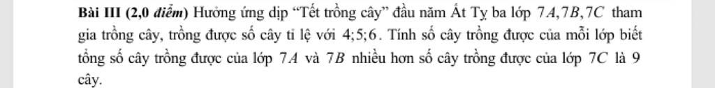 Vậy lớp `7A` trồng được `12` cây, `7B` được `15` cây, `7C` được `18` cây