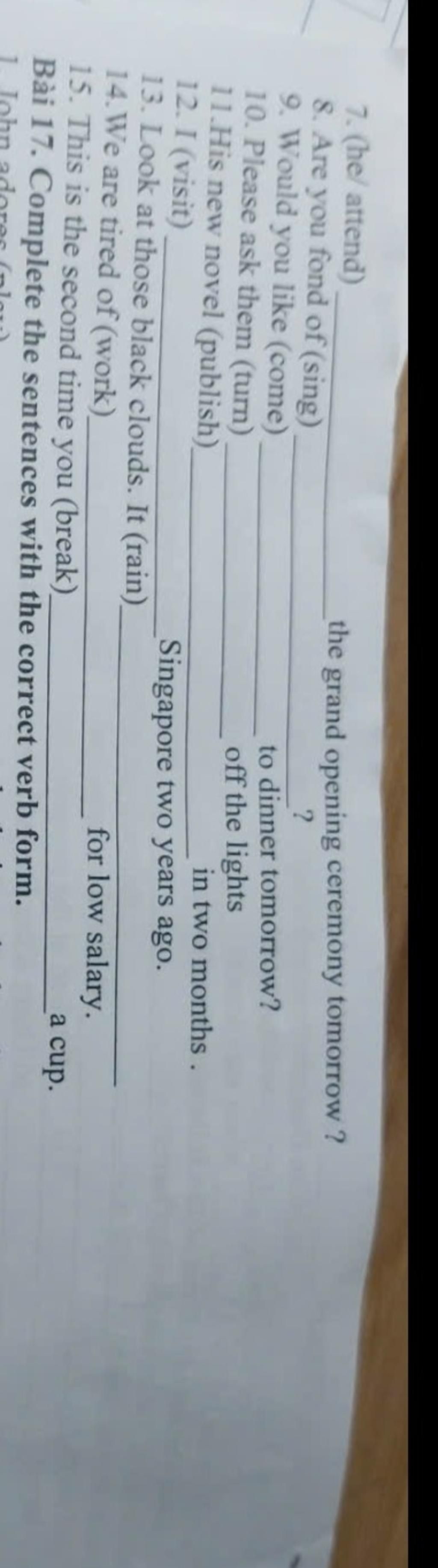 7) will he Attend vì có tomorrow là dhnhận biết ⇒tương lai đơn ở nghi vấn nên S+will+V +0?