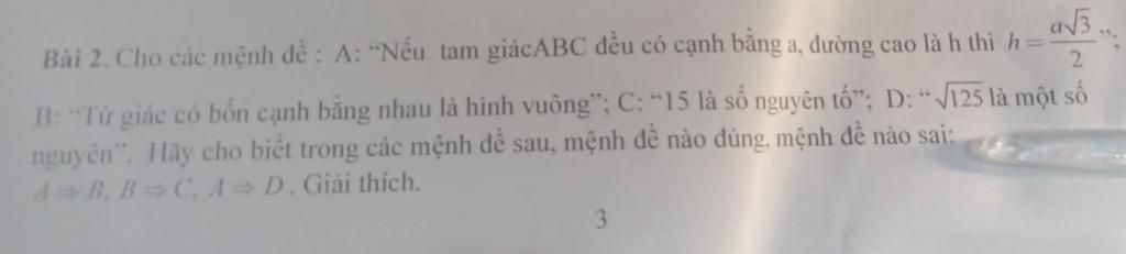Bài 2. Cho các mệnh để : A: "Nếu tam giácABC đều có cạnh bằng a, đường cao là h thì h = 2