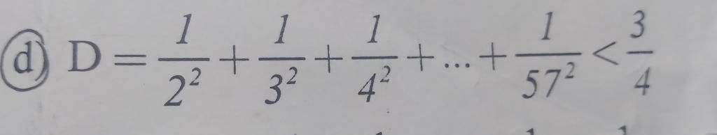 `D = 1/2^2 + 1/3^2 + 1/4^2 + ... + 1/57^2 < 3/4`