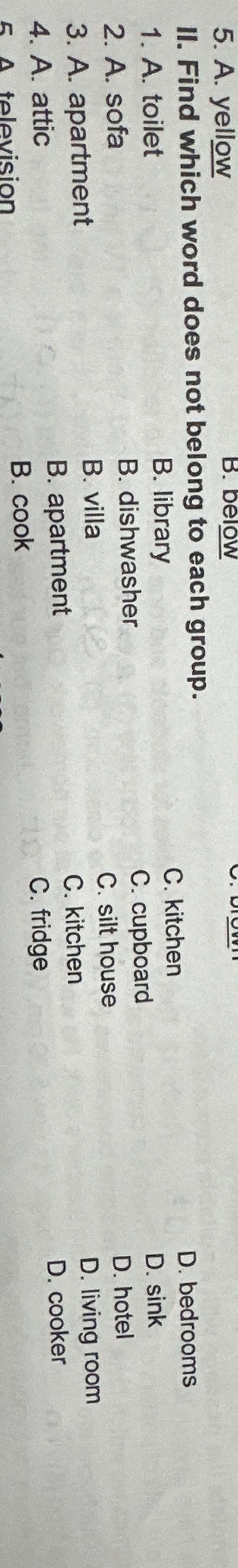 ⇒ Chọn câu B vì từ ''library'' ở trường (school) còn 3 từ còn lại là ở nhà (house)