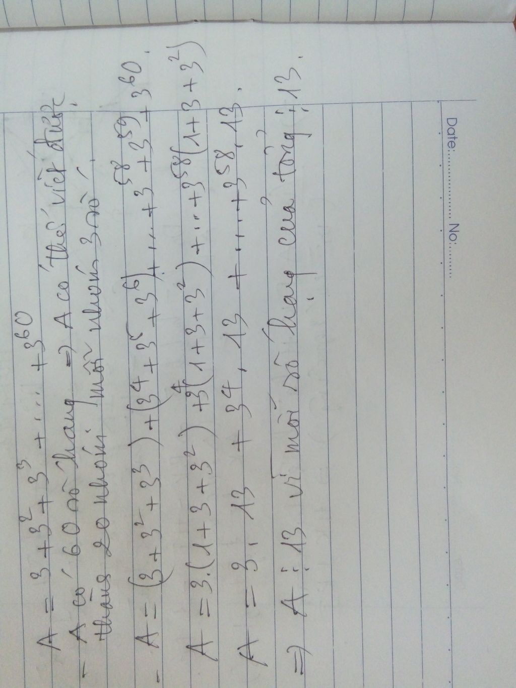 \(\begin{array}{l} 3 + {3^2} + {3^3} + ... + {3^{60}} = \left( {3 + {3^2} + {3^3}} \right) + \left( {{3^4} + {3^5} + {3^6}} \right) + ...+\left( {{3^{58}} + {3^{59}} + {3^{60}}} \right)\\ = \left( {3 + {3^2} + {3^3}} \right) + {3^3}.\left( {3 + {3^2} + {3^3}} \right) + ... + {3^{57}}.\left( {3 + {3^2} + {3^3}} \right) \end{array}\)