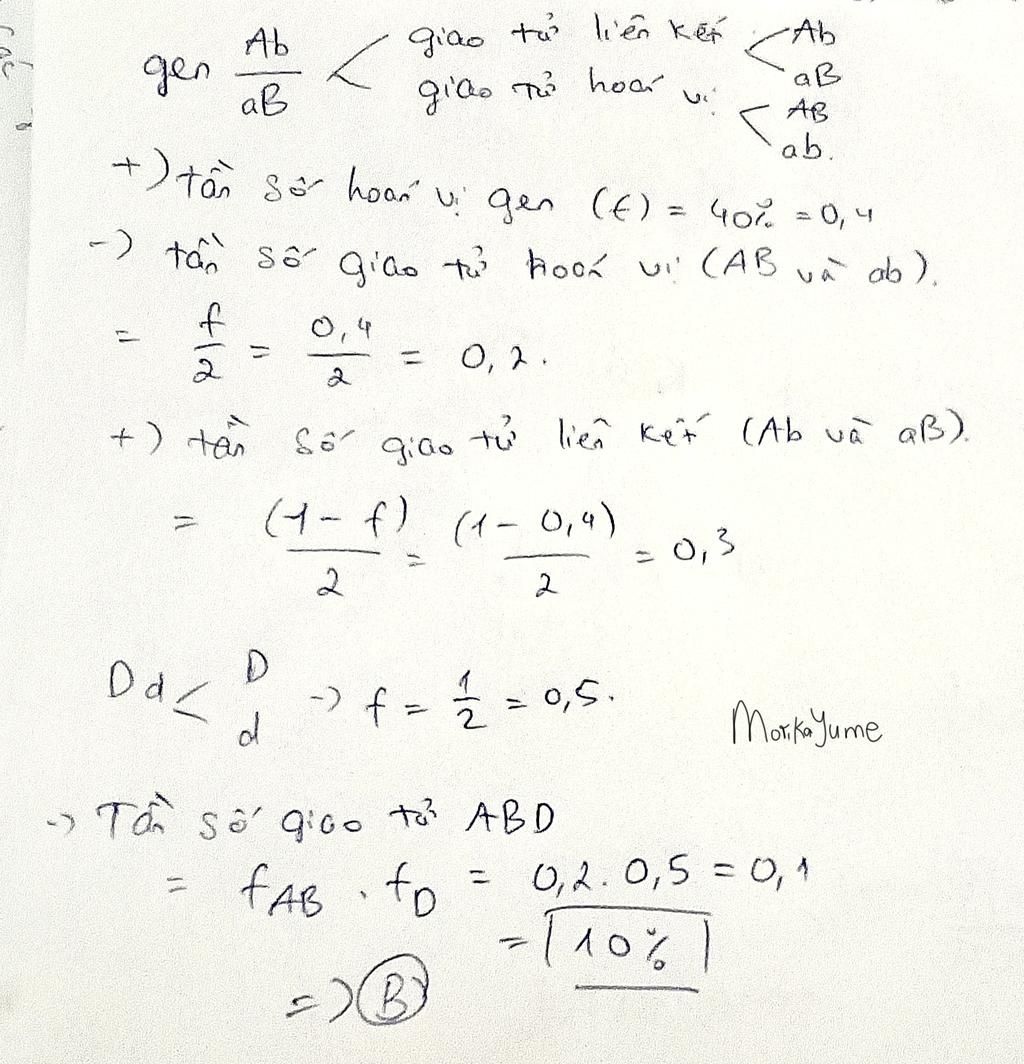 Môt cơ thể có kiểu gen $\frac{Ab}{aB}$ Dd tiến hành giảm phân có hoán vi gen với tần số 40%. Theo lí thuyết, loại giao tử ABD chiếm tỉ lê bao nhiêu?