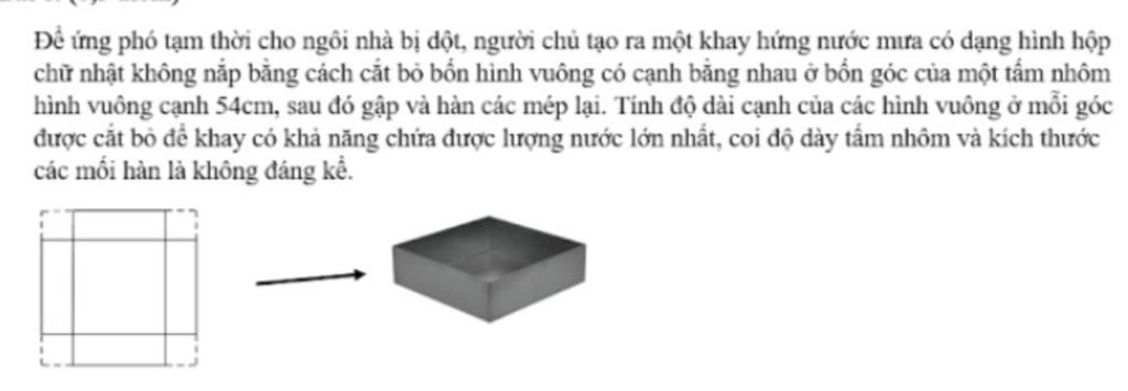 ĐK: `x in (0,27)` sao cho `V(x) = x ( 54 - 2x )^2` đạt giá trị lớn nhất