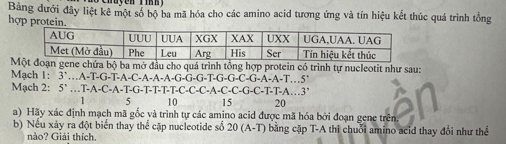 b) Sau đột biến vị trí 19-21 trên mạch mã là: A-T-A ⇒ mARN: U-A-U (ko có trong bảng), vì khi đột biến mạch mã gốc, kết quả tổng hợp mARN sẽ bị ảnh hưởng trực tiếp vì tuân theo nguyên tắc bổ sung.