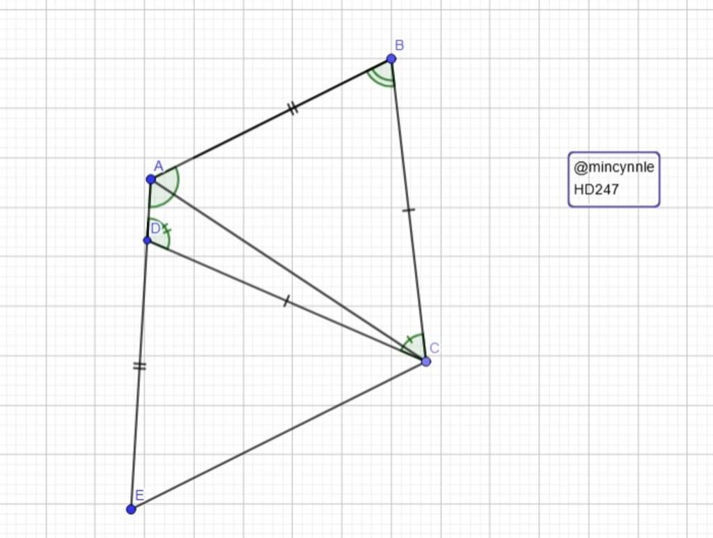 Cho tứ giác `ABCD` có `\hat(B)``+``\hat(D)``=``180^@` và `CB=CD`. Trên tia đối của tia `DA` lấy điểm `E` sao cho `DE=AB`
