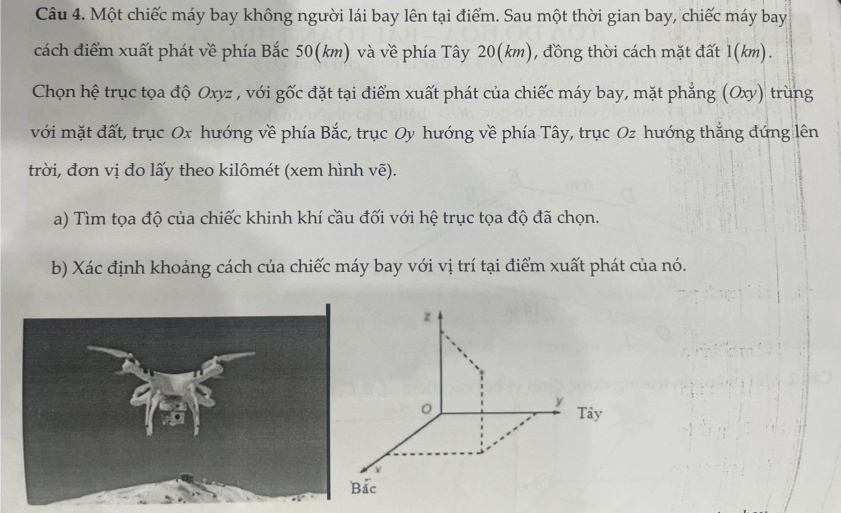 Trục `Oz:` Máy bay cách mặt đất `20km` `=> z = 1 km`