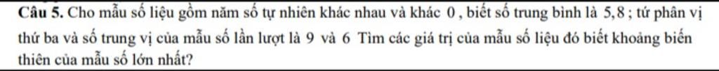 Gọi $x_1$ đến $x_5$ là các số nằm trong mẫu số liệu theo thứ tự không giảm $(0 < x_1 \le x_2 \le x_3 \le x_4 \le x_5)$