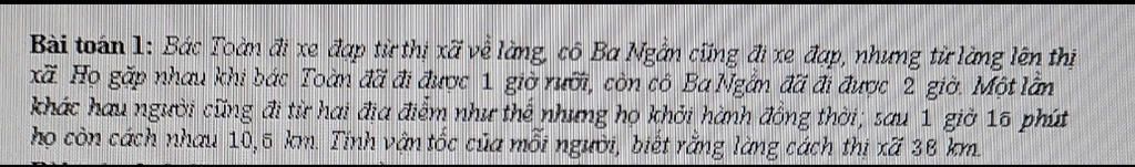 Vì hai người đi ngược chiều nhau, bác Toàn đi 1 giờ 30 phút, cô ba Ngần đi 2 giờ thì gặp nhau và tổng quãng đường họ đi được bằng khoảng cách từ làng đến thị xã nên ta có phương trình: `1,5x + 2y = 38`