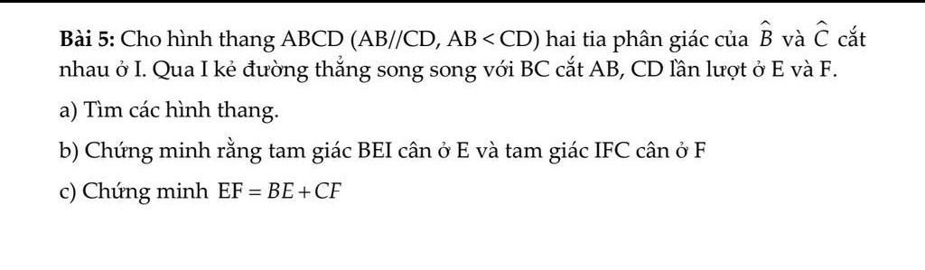 $\to \widehat{EBI}=\widehat{IBC}=\widehat{BIE}$