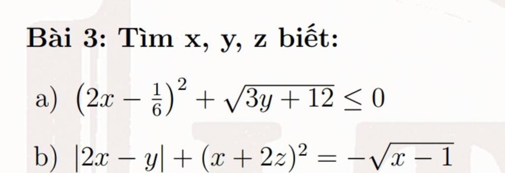 a) ta có ( 2x - 1/6 ) bình và căn 3y + 12 luôn lớn hơn hoặc bằng 0
