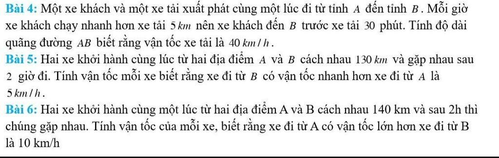 Gọi vận tốc xe đi từ A và B lần lượt là a, a+5 km/h (a,b>0)