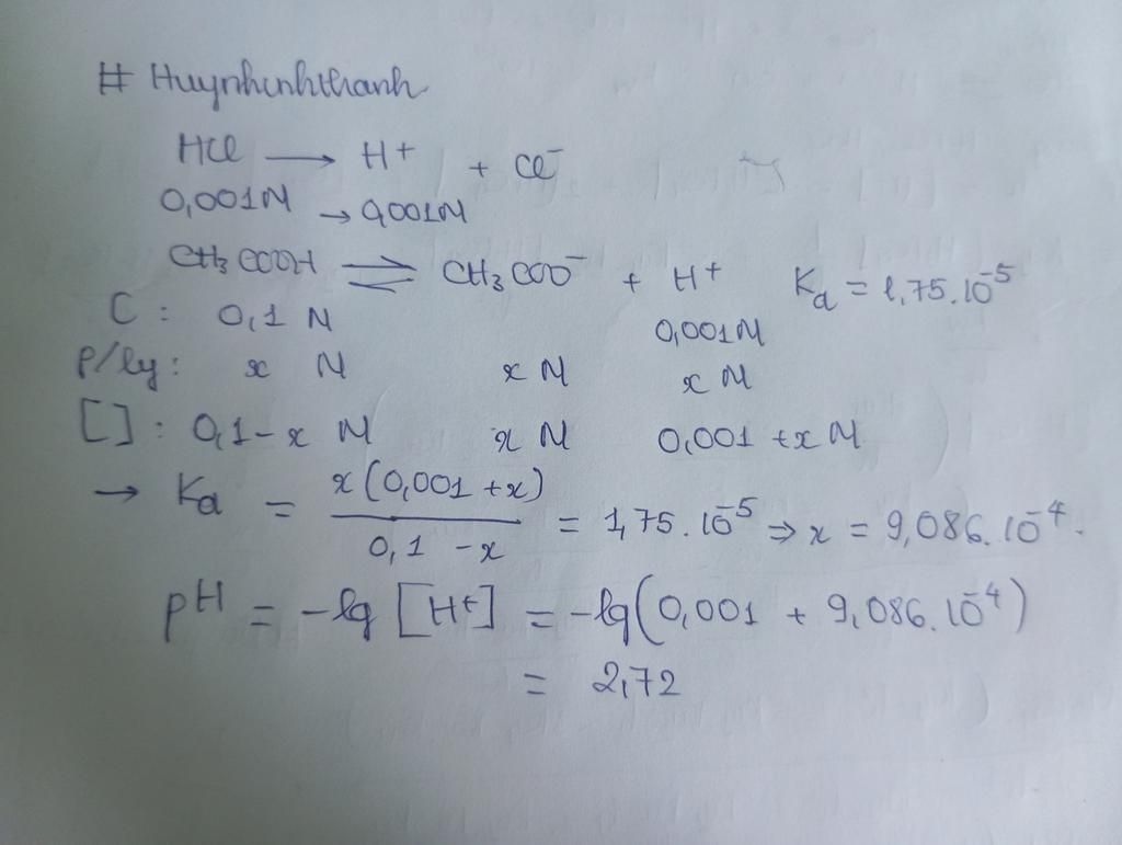 Cho dd hh X gồm HCl 0,001M và $CH_3COOH$ 0,1M. Biết $K_{c_{CH_3COOH}}=1,75.10^{-5}$ và bỏ qua sự phân li của nước. Giá trị pH của dd A là