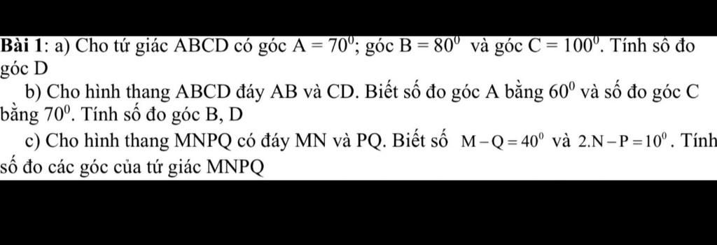 Bài 1: a) Cho tứ giác ABCD có góc A = 70; góc B