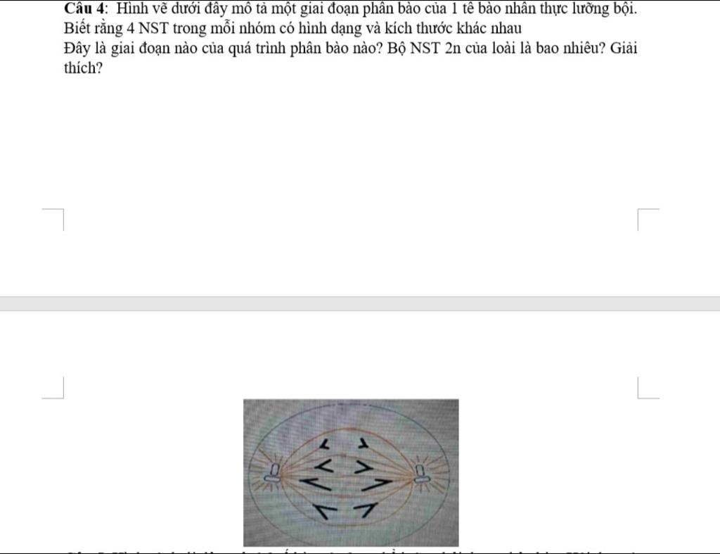 -Đây là giai đoạn kì sau của quá trình phân bào. Vì ta thấy nst chia thành 2 nhóm và thoi phân bào kéo các nst về 2 cực của tế bào