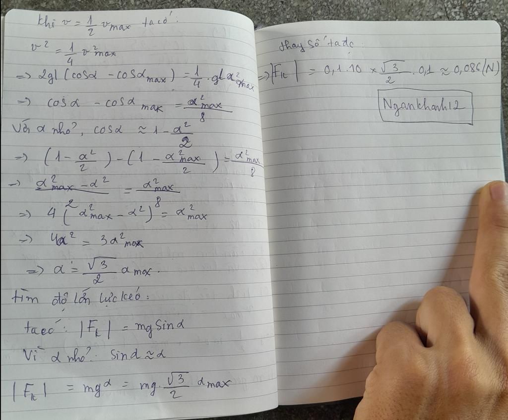 `v_{\text{max}} = \sqrt{2gl(1 - \cos \alpha_0)} \approx \sqrt{gl \alpha_0^2}(` Với `\alpha_0` nhỏ `)`