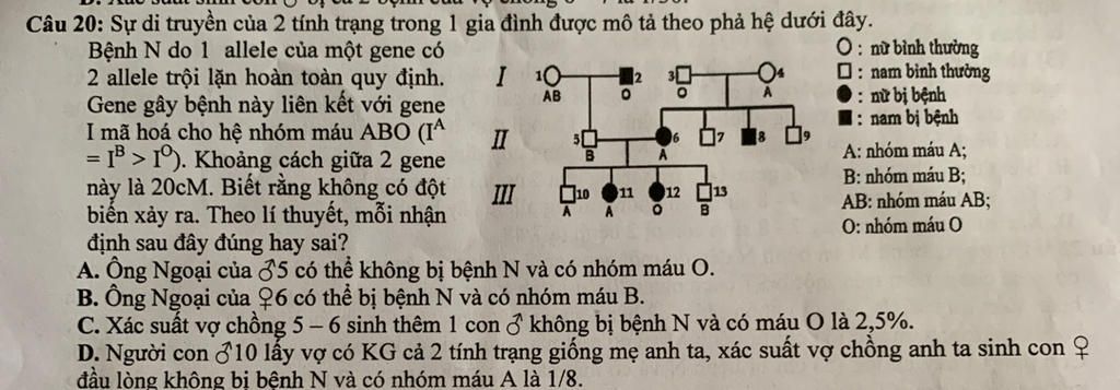 Câu 20: Sự di truyền của 2 tính trạng trong 1 gia đình được mô tả theo phả hệ dưới đây.