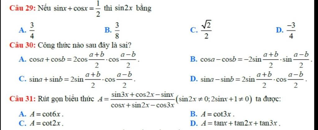 Câu `30:`Sai ý D. Vì công thức đúng phải là: `sina - sinb = 2cos((a+b)/2)sin((a-b)/2)`