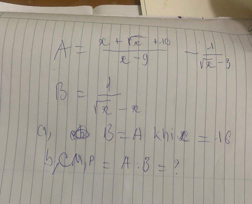 `a) A=(x+sqrt{x}+10)/(x-9)-1/(sqrt{x}-3)` (ĐKXĐ: `x ne9`)