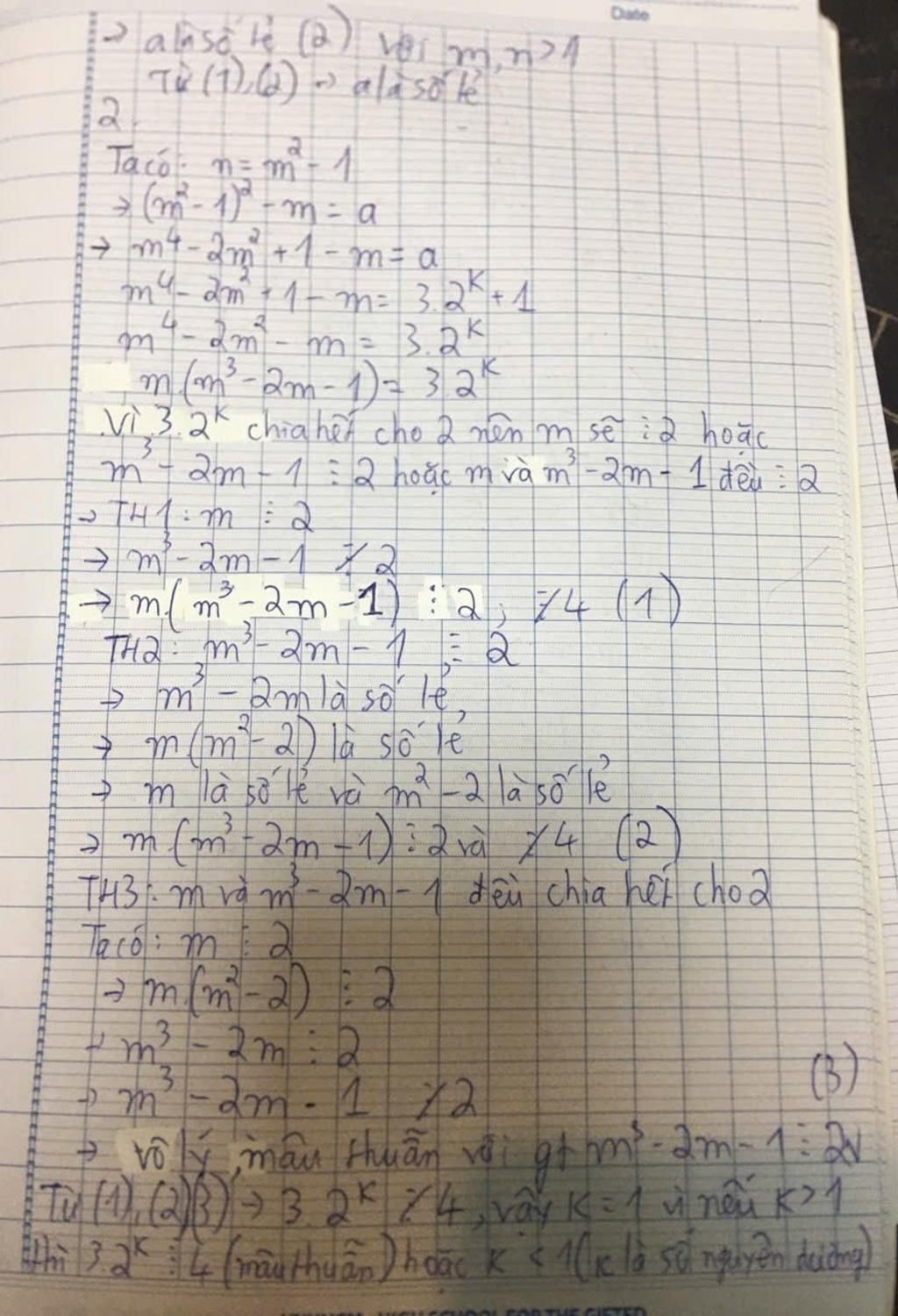 mình cần các bạn chứng minh 1 cái ý nhỏ này để mình làm được câu này ý, bạn dùng các dữ kiện chứng minh sao cho với m chia hết cho 4 thì $m^{4}$ - 2$m^{2}$ -m =3.$2^{k}$ nó sai, nó chắc chắn sẽ sai nhưng mà mình đang bí cái ý nhỏ này. Giải thích ý tưởng; ý tưởng của mình là lấy n= $m^{2}$ - 1 thế vào ptr đã cho ở (a) xong mình cm $m^{4}$ - 2$m^{2}$ -m chia hết cho 2 nhưng chia hết cho 4 -> k=1 đến đây thì phải cm thêm cái nữa là $m^{4}$ - 2$m^{2}$ -m với m chia hết cho 4 thì nó mâu thuẫn gì đó các bạn ơi giúp mình với, bên dưới là bài làm của mình