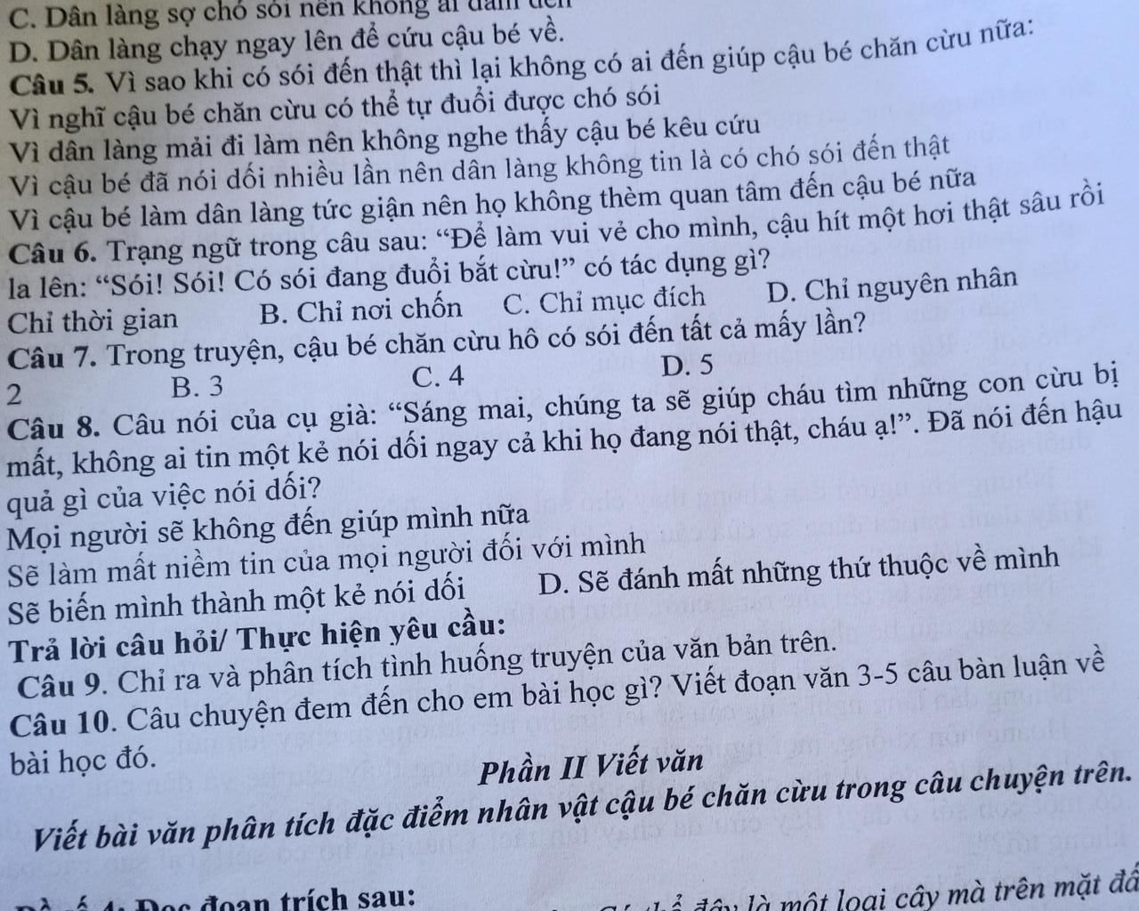 Giải thích các bước giải: Giải thích câu 5 : Câu chuyện ... nhấn mạnh hậu quả về việc nói dối . Cậu bé đã nhiều lần nói dối dân làng , khiến dân làng mất lòng tin về cậu . Khi sói đến thật , cậu bé đã kêu cứu những cũng không ai tin câu và giúp nữa