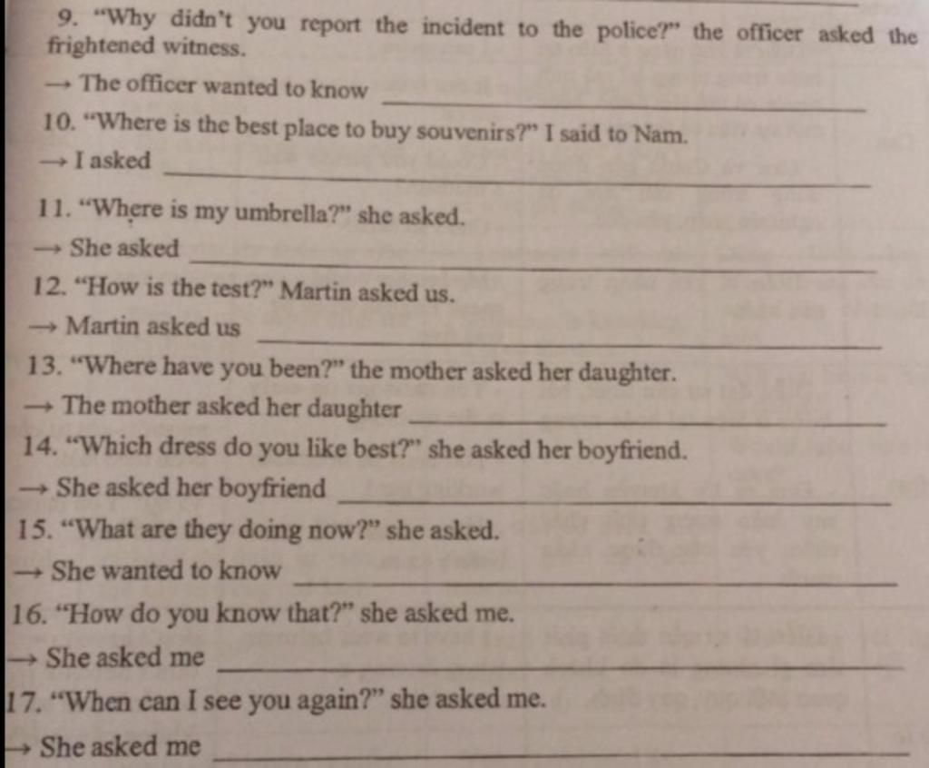 `->` S + asked O/wanted to know/wondered + wh-q + S + V(lùi thì)